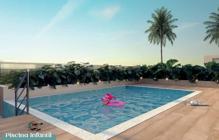 Condomínio com duas torres e área de lazer completa, incluindo piscina, sauna, salão de festas, espaço gourmet, churrasqueira e playground.